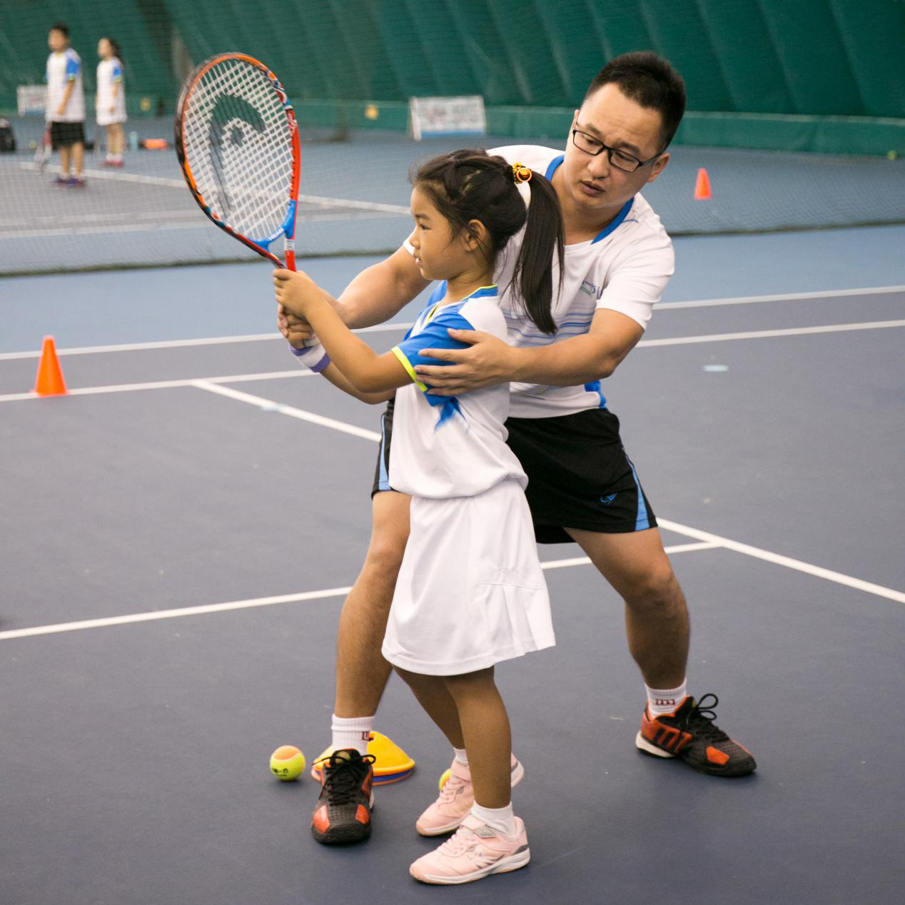 从球感练习,到教练握拍示范,然后纠正每个小朋友的动作。从握拍开始,让每个小朋友学会最标准的姿势。